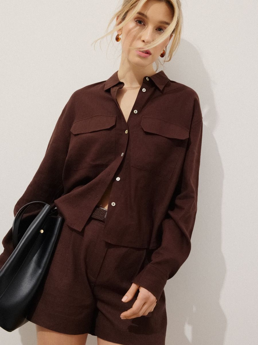 Camisa en mezcla de viscosa y lino Color marrón oscuro MOHITO