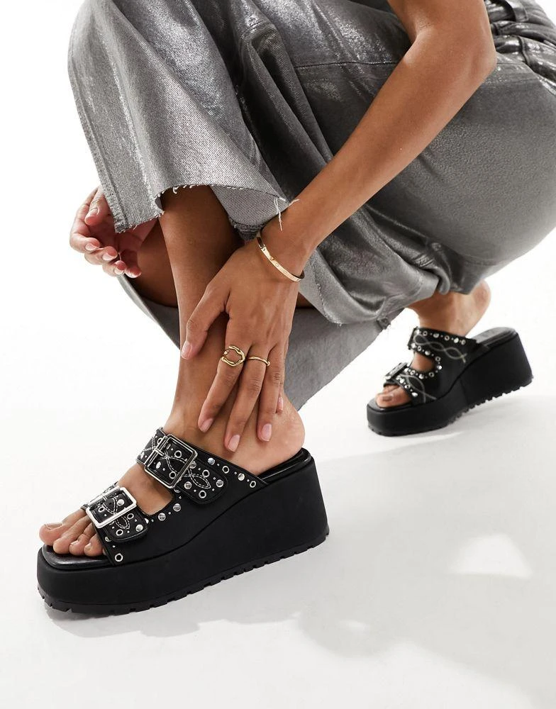 Shop ASOS DESIGN Texas buckle detail studded wedge mules in black Special Offer